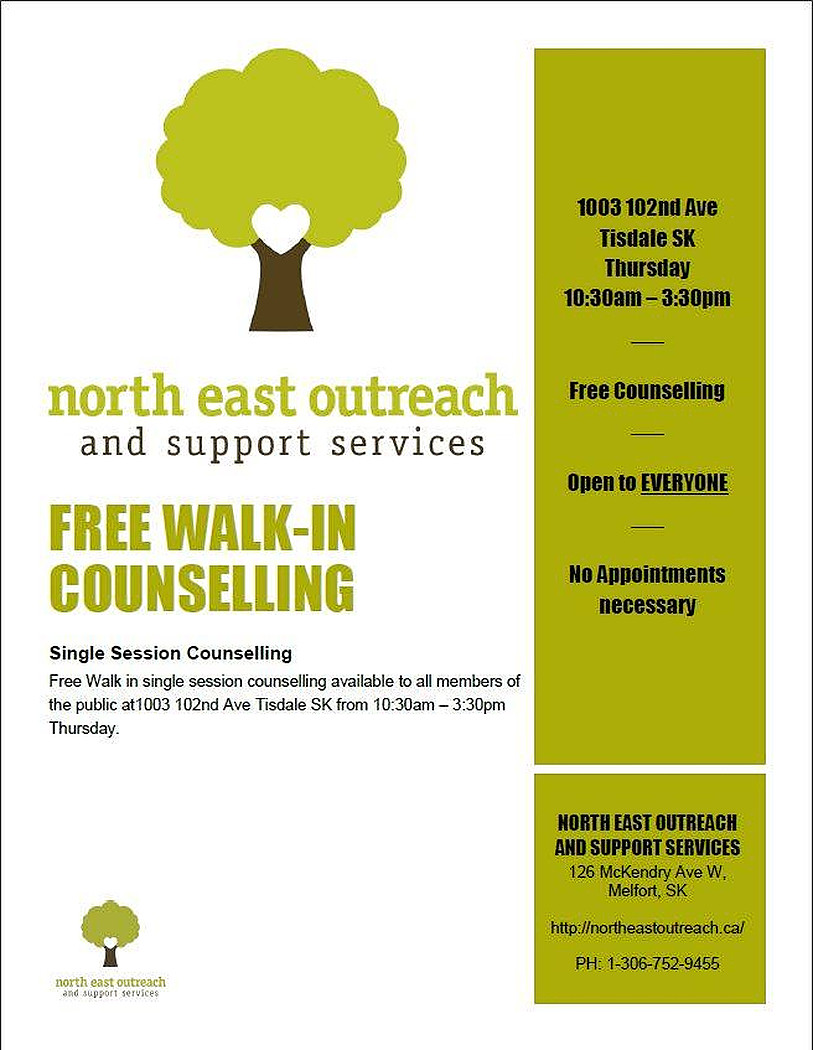 We are glad to announce that free walk-in, single-session counselling now available in Tisdale, every Thursday starting August 8th.