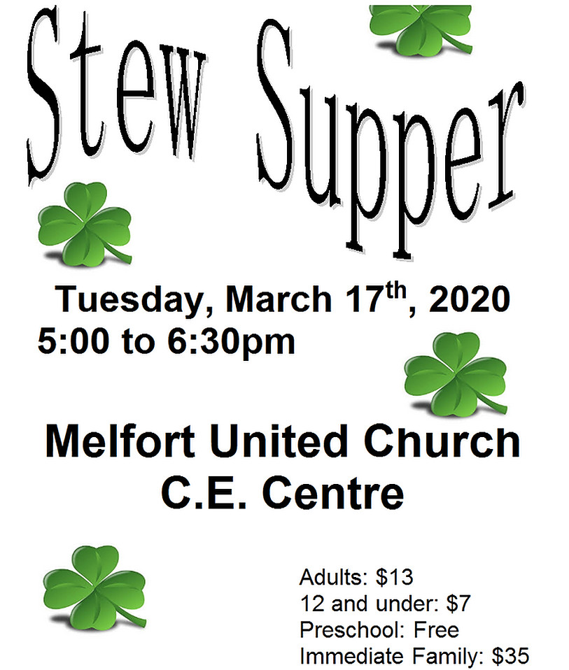 The Melfort United Church C.E. Centre is celebrating St. Patrick’s Day with a Stew Supper on Tuesday, March 17.