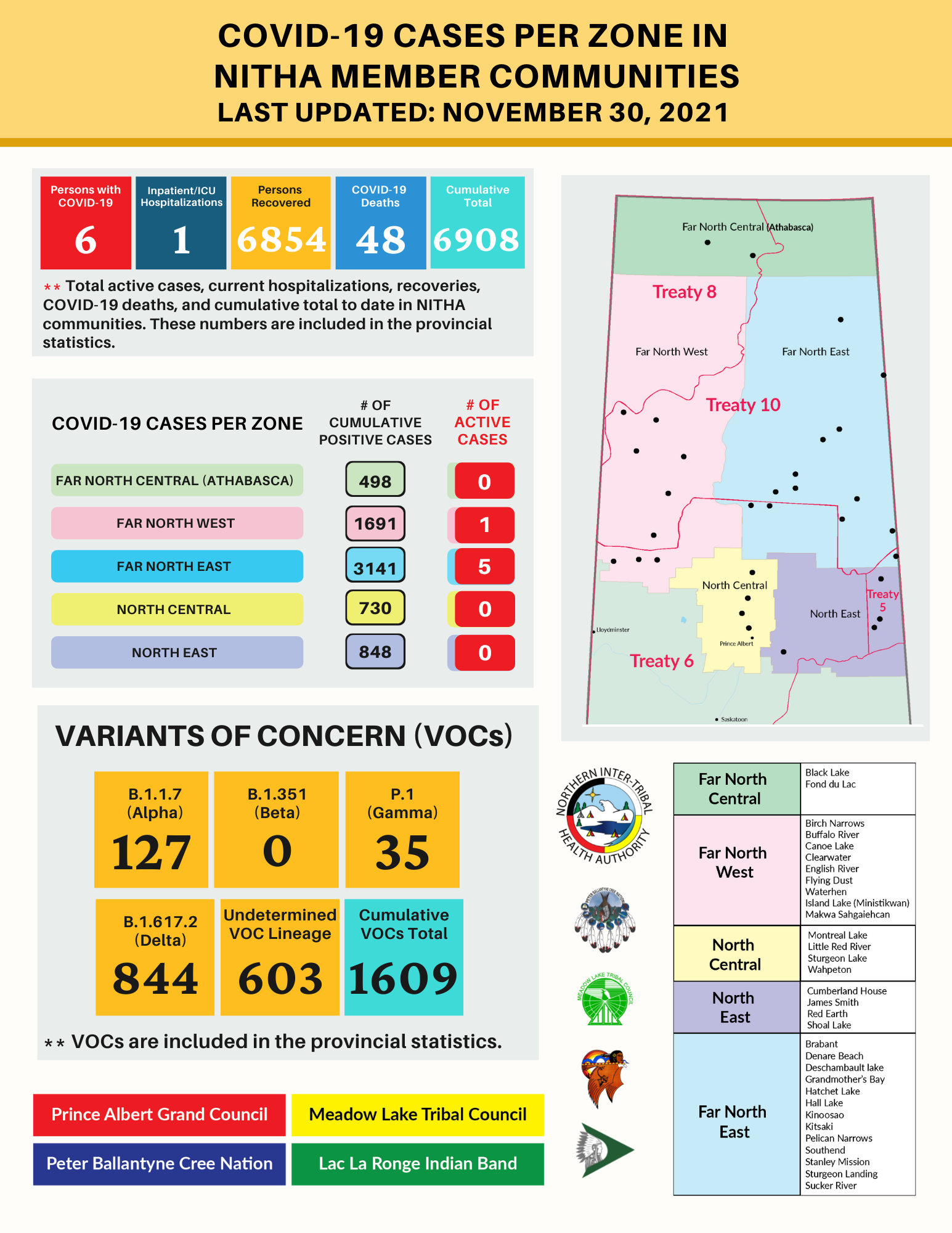 There are six active cases of COVID-19 in NITHA communities in the Far North Central (Athabasca), 0; Far North West, one; Far North East, five; North Central, 0; and North East, 0.