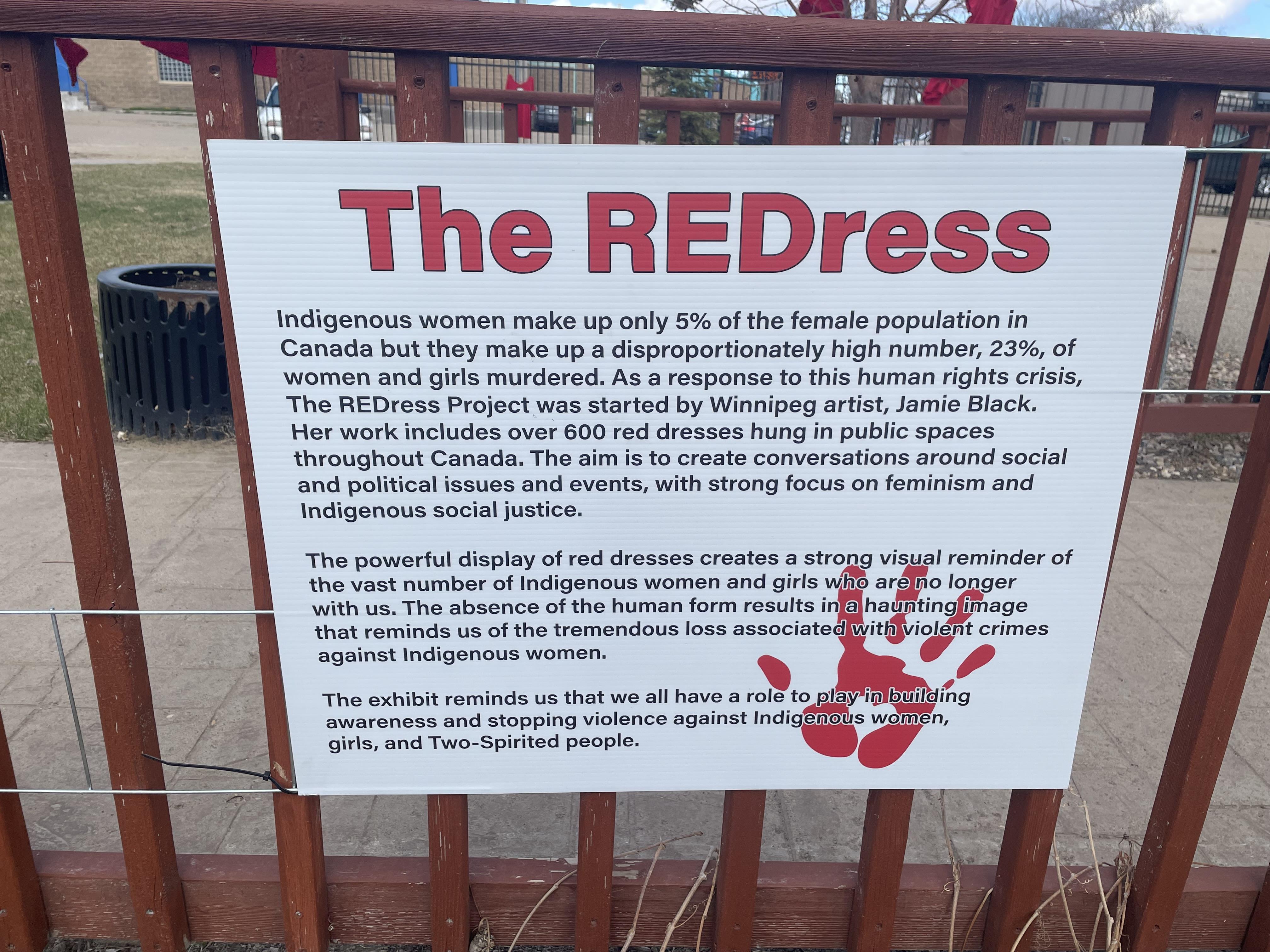 A Red Dress sign is also posted at the memorial garden in Melfort, which reveals the tragic Canadian statistics.