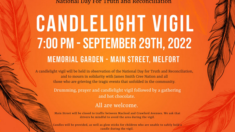 The City of Melfort is hosting a Candlelight Vigil for National Day for Truth and Reconciliation at 7:00 p.m. at Memorial Garden. See the poster for details.
